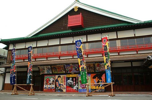 木造2階建て入母屋造りの芝居小屋として、昭和6(1931)年に落成。桟敷席、通路を設けた桝席、2本の花道、回り舞台などがある全国でも数少ない劇場の一つ。間口10間(約18m)の大きな梁を構成することで、柱を使わずに建てられた1,200人収容可能な客席は、この地がかつて炭鉱で栄えていたからできたといえる贅沢な空間です。 建物は国の登録有形文化財に指定。休演日には劇場内を自由に見学できます